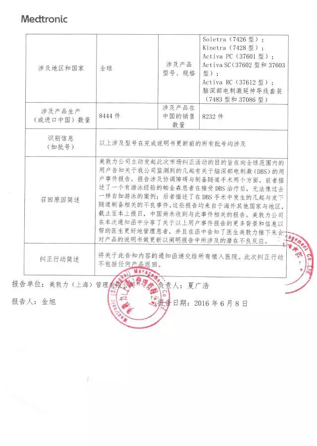1、美敦力(上海)管理有限公司對(duì)可植入神經(jīng)刺激系統(tǒng)、植入式神經(jīng)刺激系統(tǒng)、植入式神經(jīng)刺激器、可充電植入式神經(jīng)刺激器、腦深部電刺激延伸導(dǎo)線套裝主動(dòng)召回