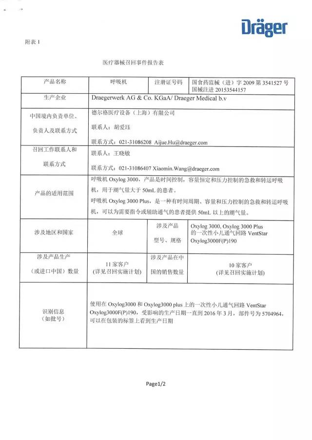 6、德爾格醫(yī)療設(shè)備(上海)有限公司對(duì)呼吸機(jī)主動(dòng)召回