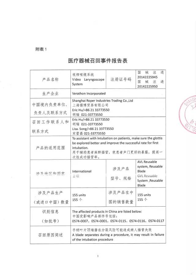 8、上海儒博貿(mào)易有限公司對(duì)視頻喉鏡系統(tǒng)主動(dòng)召回