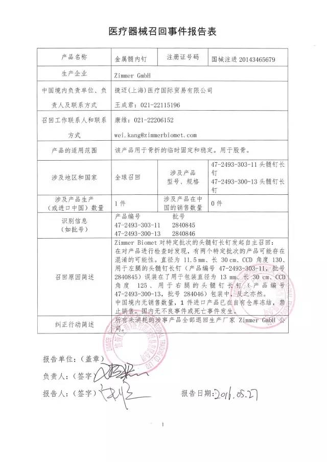 12、捷邁(上海)醫(yī)療國際貿(mào)易有限公司對(duì)金屬髓內(nèi)釘主動(dòng)召回