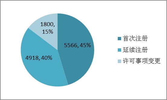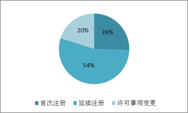 按注冊(cè)形式區(qū)分,首次注冊(cè)申請(qǐng)2402項(xiàng),延續(xù)注冊(cè)申請(qǐng)5105項(xiàng),許可事項(xiàng)變更申請(qǐng)1889項(xiàng)。