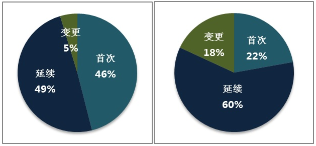 從注冊(cè)形式看,首次注冊(cè)申請(qǐng)1562項(xiàng),占40%;延續(xù)注冊(cè)申請(qǐng)1635項(xiàng),占42%;許可事項(xiàng)變更注冊(cè)申請(qǐng)724項(xiàng),占18%。