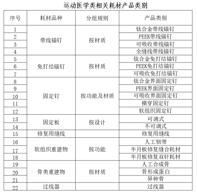 2.運(yùn)動(dòng)醫(yī)學(xué)類相關(guān)耗材: 獲得中華人民共和國(guó)醫(yī)療器械注冊(cè)證的帶線錨釘、免打結(jié)錨釘、界面固定釘、橫穿固定釘、軟組織固定釘、可調(diào)式固定板、不可調(diào)式固定板、修復(fù)用縫線、人工韌帶、半月板修復(fù)縫合耗材、半月板修復(fù)雙針耗材、人工合成骨、骨形成蛋白、異種骨、過(guò)線器。