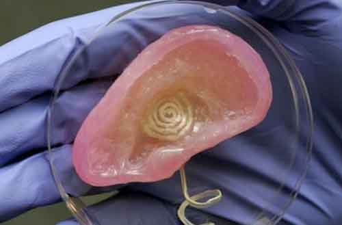 科學家們選擇的打印材料為水凝膠,一種在組織工程學中其支撐作用的化學物質,接著用Fab@Home3D打印機打印出仿生耳朵,然后將從小牛身上獲取的細胞注入水凝膠中,接著加入一種含有納米銀粒子的聚合物,這種聚合物可以傳播無線射頻信號。最后將小牛細胞成長為軟骨組織,并圍繞一個線圈天線變硬。