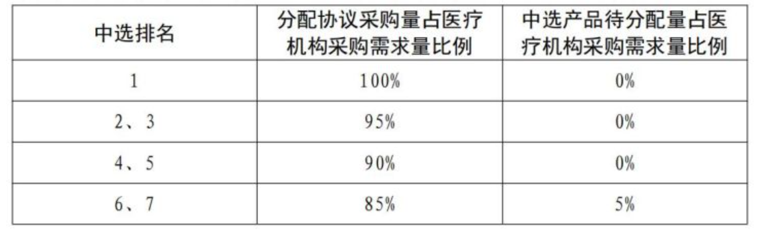 集中采購(gòu)結(jié)果執(zhí)行周期內(nèi),根據(jù)各醫(yī)療機(jī)構(gòu)填報(bào)的采購(gòu)需求量,將中選產(chǎn)品協(xié)議采購(gòu)量分配給對(duì)應(yīng)中選企業(yè)1.競(jìng)價(jià)單元內(nèi)按中選排名順序及中選規(guī)則,梯度分配醫(yī)療機(jī)構(gòu)的協(xié)議采購(gòu)量,如出現(xiàn)小數(shù)則向上取整至個(gè)位。