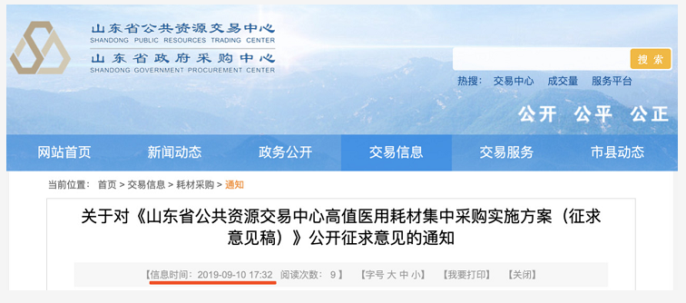 昨日(9月10日),山東省公共資源交易中心發(fā)布關(guān)于對(duì)“高值醫(yī)用耗材集中采購(gòu)實(shí)施方案”公開征求意見的通知。