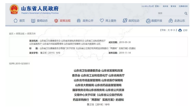 《實(shí)施方案》由山東省衛(wèi)生健康委員會(huì)、山東省發(fā)展和改革委員會(huì)、山東省工業(yè)和信息化廳、山東省商務(wù)廳、山東省市場監(jiān)督管理局、山東省醫(yī)療保障局、山東省大數(shù)據(jù)局、山東省藥品監(jiān)督管理局、國家稅務(wù)總局山東省稅務(wù)局、山東省公共資源交易中心10個(gè)部門聯(lián)合印發(fā)。