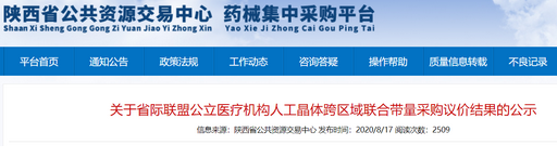 醫(yī)藥網(wǎng)8月20日訊 8月17日,陜西省公共資源交易中心發(fā)布《關(guān)于省際聯(lián)盟公立醫(yī)療機構(gòu)人工晶體跨區(qū)域聯(lián)合帶量采購議價結(jié)果的公示》。