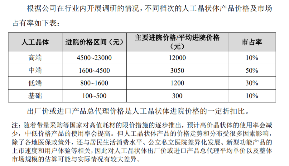 愛博諾德在招股書中稱,在安徽省帶量采購中,其 A1-UV 型號人工晶狀體產(chǎn)品的中標(biāo)價(進(jìn)院價)為 1950 元/片,降幅為 18.1%。