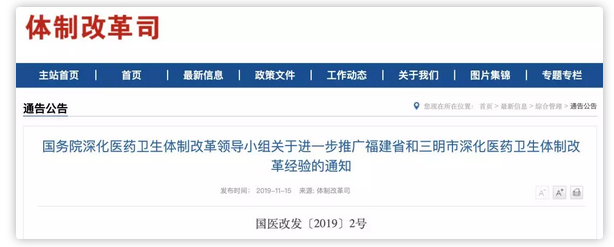 11月15日,國務院深化醫(yī)藥衛(wèi)生體制改革領導小組下發(fā)《關于進一步推廣福建省和三明市深化醫(yī)藥衛(wèi)生體制改革經(jīng)驗的通知》(以下簡稱“通知”)釋放重大信號。