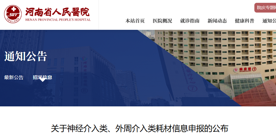 近日,河南省人民醫(yī)院官網(wǎng)發(fā)布《關(guān)于神經(jīng)介入類(lèi)、外周介入類(lèi)耗材信息申報(bào)的公布》,醫(yī)療機(jī)構(gòu)將根據(jù)產(chǎn)品申報(bào)信息進(jìn)行相關(guān)采購(gòu)數(shù)據(jù)填報(bào)。