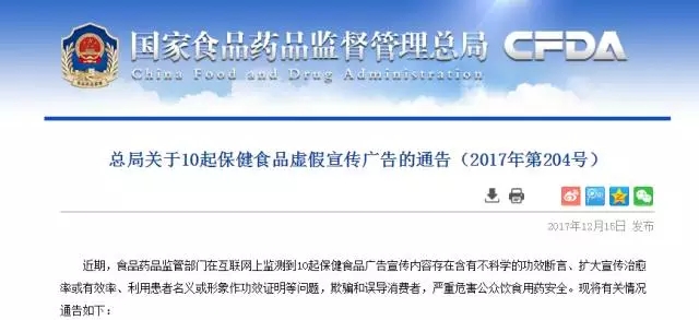 這不,這一次,CFDA又調(diào)查、處罰了一批問題企業(yè)。12月15日,國家食藥監(jiān)總局通告10起保健食品虛假宣傳廣告。通報(bào)稱,這些廣告中使用諸如“無藥勝藥,屢見神效”、“抑制癌細(xì)胞擴(kuò)散率達(dá)89.3%”、“ 除藥物之外見效最快”等內(nèi)容,欺騙和誤導(dǎo)消費(fèi)者。食藥監(jiān)部門已將其違法行為通報(bào)有關(guān)部門查處,并依法收回其有效期內(nèi)的廣告批準(zhǔn)文號(hào),責(zé)令產(chǎn)品暫停銷售。