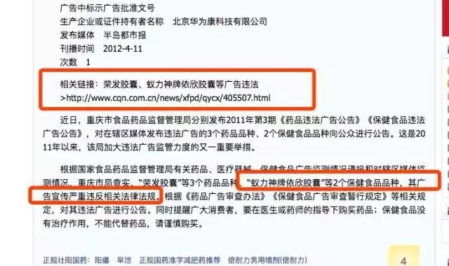小編百度了一下,這次被通報(bào)的十個(gè)“神藥”廣告中,有不少都是多次被監(jiān)管部門掛了號(hào)的。其中號(hào)稱“降壓老土方”的“蟻力神牌依欣膠囊早在2010年、2011年多次上過“黑名單”,被監(jiān)管部門處理。而“正穎牌紅景天顆粒”也曾因菌落總數(shù)不合格,被北京市食藥監(jiān)局責(zé)令全市下架。