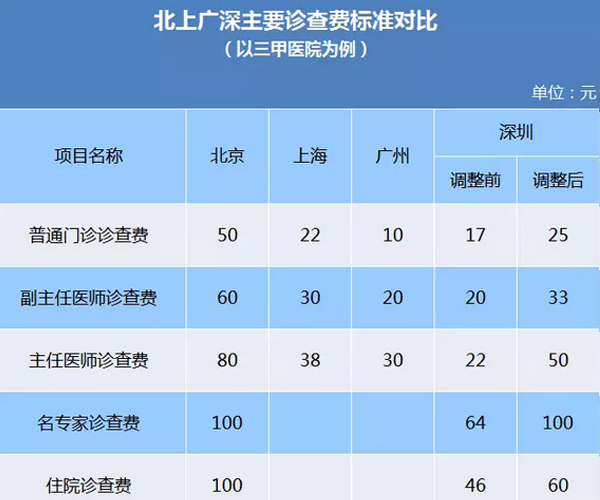 這次提價后,深圳拉大了不同級別醫(yī)生之間的診查費差距。