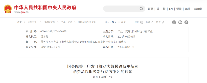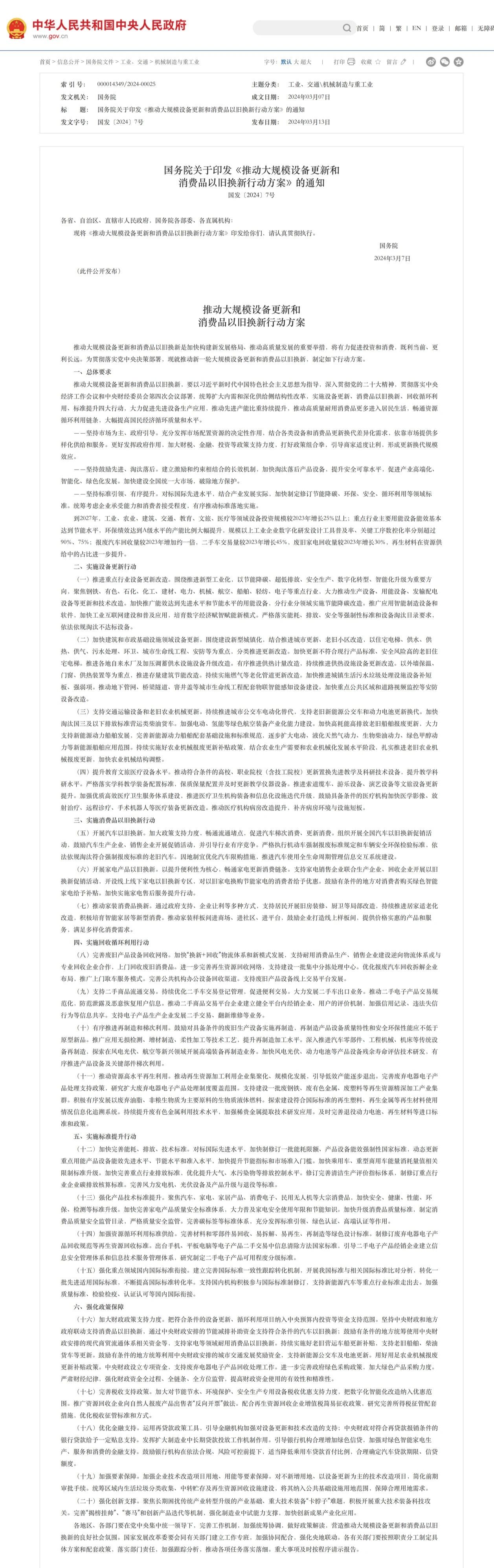 3月13日,國務(wù)院發(fā)布《推動大規(guī)模設(shè)備更新和消費品以舊換新行動方案》(以下簡稱《方案》)。其中指出,到2027年,工業(yè)、農(nóng)業(yè)、建筑、交通、教育、文旅、醫(yī)療等領(lǐng)域設(shè)備投資規(guī)模較2023年增長25%以上(文末附全文)。
