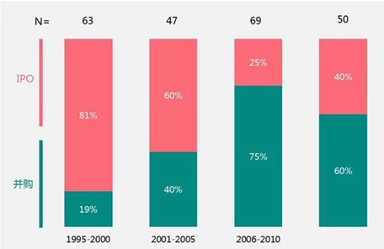 而2006-2010年段,在所有規(guī)模的風(fēng)投退出方式中,并購方式超過75%,盡管2013年IPO方式改寫了這一數(shù)字,但仍然未能撼動并購方式的主導(dǎo)地位,最近的幾年間,在大于2.5億美元的公司或項(xiàng)目中超過60%以并購方式退出,并購企業(yè)的含金量已經(jīng)大幅度提升。