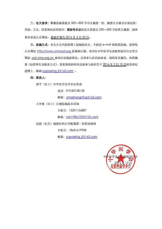 三、投稿方式:本次大會(huì)只接收網(wǎng)上投稿的論文,不接受e-mail和紙質(zhì)投稿;請(qǐng)登陸大會(huì)網(wǎng)站http://2016.cmacsd.org/投稿和注冊(cè),也可在中華醫(yī)學(xué)會(huì)皮膚性病學(xué)分會(huì)官方網(wǎng)站csd.cma.org.cn查詢會(huì)議鏈接信息。自薦參與欄目的講者,請(qǐng)將發(fā)言題目、內(nèi)容摘要(包括單位及聯(lián)系方式)、需要演講的時(shí)間及擬參與的欄目于2016年2月10日前發(fā)給紀(jì)超博士,郵箱surpassing_ji@163.com 。
