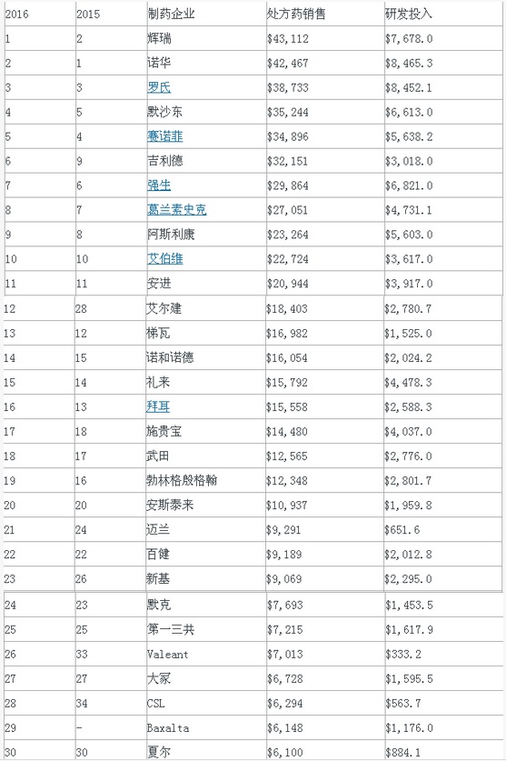 2016年全球制藥企業(yè)50強出爐!