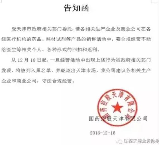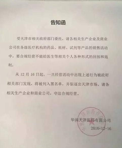 天津市衛(wèi)計委在全市掀起了嚴厲整肅行業(yè)不正之風(fēng)的專項行動,各大醫(yī)院紛紛展開部署,收取紅包、回扣等行為。而天津國控和華潤天津醫(yī)藥兩大商業(yè)巨頭,也同時向其配送的生產(chǎn)企業(yè)和商業(yè)公司發(fā)通知,勿在對醫(yī)療機構(gòu)的藥品、耗材、試劑等產(chǎn)品銷售活動中給醫(yī)生送回扣或返利。
