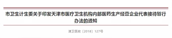 5月18日,天津市衛(wèi)計委印發(fā)《天津市醫(yī)療衛(wèi)生機構(gòu)內(nèi)部醫(yī)藥生產(chǎn)經(jīng)營企業(yè)代表接待暫行辦法》(以下簡稱暫行辦法)。