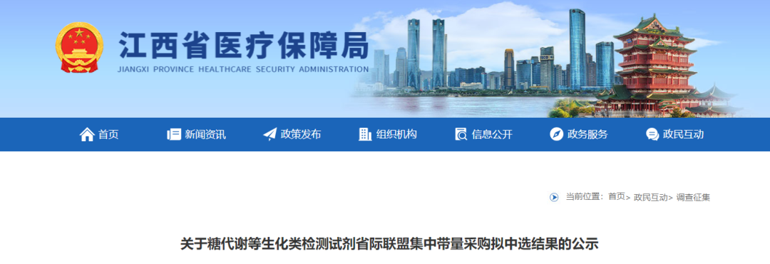近日,江西醫(yī)保局發(fā)布《關于糖代謝等生化類檢測試劑省際聯(lián)盟集中帶量采購擬中選結果的公示》(附文末),公示時間為2024年11月28日至2024年12月2日。
