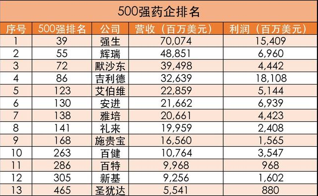 總共有13家藥企入選500強(qiáng)榜單。強(qiáng)生以700.74億美元營收排名藥企第一,總榜單第39位。藥企中僅次于強(qiáng)生的是輝瑞,營收488.51億美元,利潤69.6億美元。其他上榜的藥企包括默沙東、吉利德、艾伯維、安進(jìn)、雅培、禮來、施貴寶、百健、百特、新基、圣猶達(dá)。