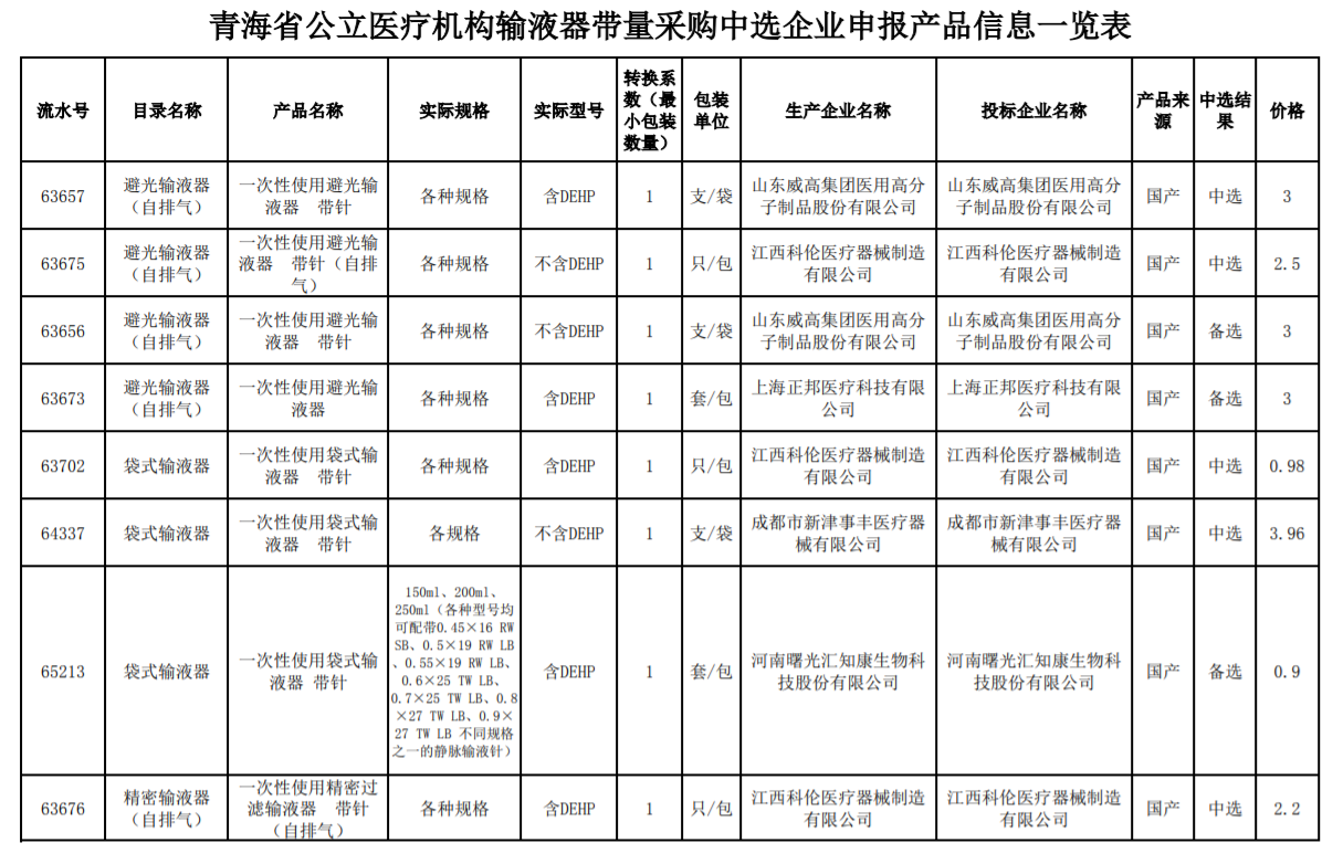 醫(yī)藥網(wǎng)9月18日訊 9月15日,青海省藥品和醫(yī)用耗材集中采購網(wǎng)發(fā)布《關于公布青海省公立醫(yī)療機構醫(yī)用耗材帶量采購中選企業(yè)申報產(chǎn)品信息的通知》,將留置針、輸液器帶量采購中選企業(yè)申報產(chǎn)品信息進行公布。