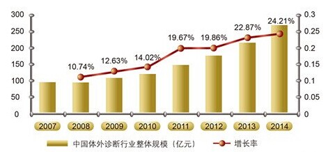 中國(guó)的體外診斷試劑行業(yè)已經(jīng)具備了一定的市場(chǎng)規(guī)模和基礎(chǔ),正從產(chǎn)業(yè)導(dǎo)入期步入成長(zhǎng)期,該市場(chǎng)的發(fā)展前景良好。2007年到2014年,中國(guó)體外診斷市場(chǎng)規(guī)模增速顯著高于全球的平均水平,目前,進(jìn)口試劑以及診斷儀器的壟斷優(yōu)勢(shì)正在被民族產(chǎn)品打破和制約,中國(guó)體外診斷試劑產(chǎn)業(yè)發(fā)展總體表現(xiàn)出的特點(diǎn)是市場(chǎng)大,市場(chǎng)潛力更大。
