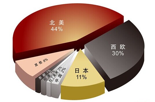 從全球體外診斷試劑市場(chǎng)劃分來(lái)看,最大的體外診斷試劑市場(chǎng)為北美地區(qū),占了44%,而西歐市場(chǎng)占據(jù)了30%,亞洲的日本和中國(guó)分別占有11%和2%。
