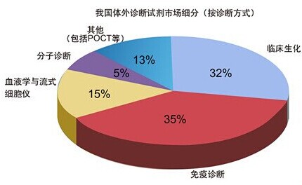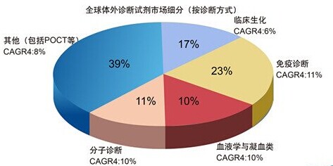 體外診斷試劑包含血液、生化、免疫、分子生物、細(xì)菌、POCT等幾大方面。從全球體外診斷試劑市場(chǎng)按照診斷方式細(xì)分,免疫診斷,臨床生化診斷以及分子診斷占據(jù)前三,發(fā)達(dá)國(guó)家的臨床生化診斷和免疫診斷市場(chǎng)已經(jīng)接近成熟,而POCT和分子診斷是診斷市場(chǎng)的主要增長(zhǎng)點(diǎn)。中國(guó)的免疫診斷試劑,臨床生化診斷試劑是最主要的兩大體外診斷試劑市場(chǎng)。