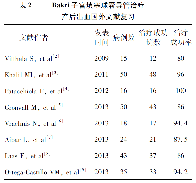 由于產(chǎn)后出血發(fā)病急,目前國(guó)內(nèi)外關(guān)于Bakri球囊導(dǎo)管治療產(chǎn)后出血尚無(wú)隨機(jī)對(duì)照研究,所有研究數(shù)據(jù)均來(lái)源于回顧性分析。近年國(guó)外學(xué)者報(bào)道,Bakri球囊導(dǎo)管治療產(chǎn)后出血成功率達(dá)80%~100%,見表2[2-9]。本研究中,使用Bakri球囊導(dǎo)管治療產(chǎn)后出血成功率為94%(60/64),與國(guó)外文獻(xiàn)報(bào)道大致相似。