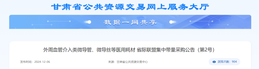 近日,甘肅公共資源交易中心發(fā)布《外周血管介入類微導管、微導絲等醫(yī)用耗材省際聯(lián)盟集中帶量采購公告(第2號)》(附文末)。