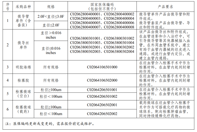 集采周期原則上為2年。集采品類包括外周血管介入類微導管(含套裝)、微導絲、明膠海綿、栓塞膠、栓塞微球。