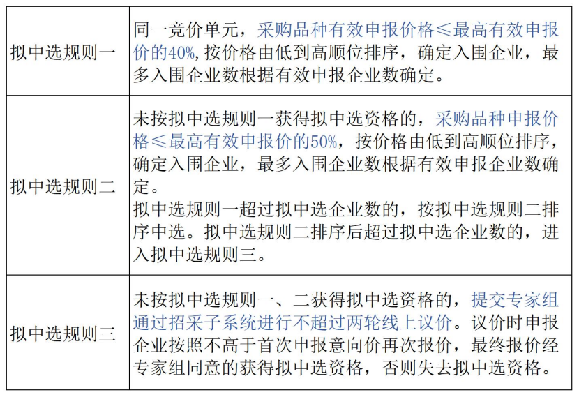 采購品種規(guī)格不足三家申報的或確因產品材質、結構等有明顯區(qū)別單列的,通過招采子系統(tǒng)進行不超過兩輪磋商撮合。磋商撮合時申報企業(yè)按照不高于首次申報意向價再次報價,最終報價經(jīng)專家組同意的獲得擬中選資格,否則失去擬中選資格。