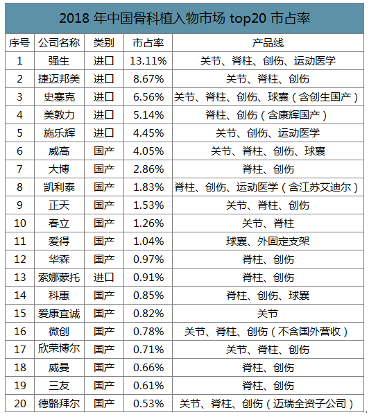 根據(jù)智研咨詢行業(yè)報(bào)告數(shù)據(jù),2018年中國骨科植入物市場前5名及市場份額分別為:強(qiáng)生13.11%、捷邁邦美8.67%、史賽克6.56%、美敦力5.14%、施樂輝4.4%。