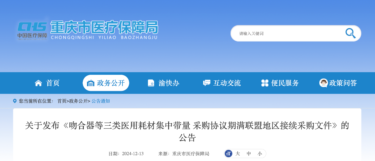 近日,重慶市醫(yī)保局發(fā)布《吻合器等三類醫(yī)用耗材集中帶量 采購協(xié)議期滿聯(lián)盟地區(qū)接續(xù)采購文件》(完整見文末)。