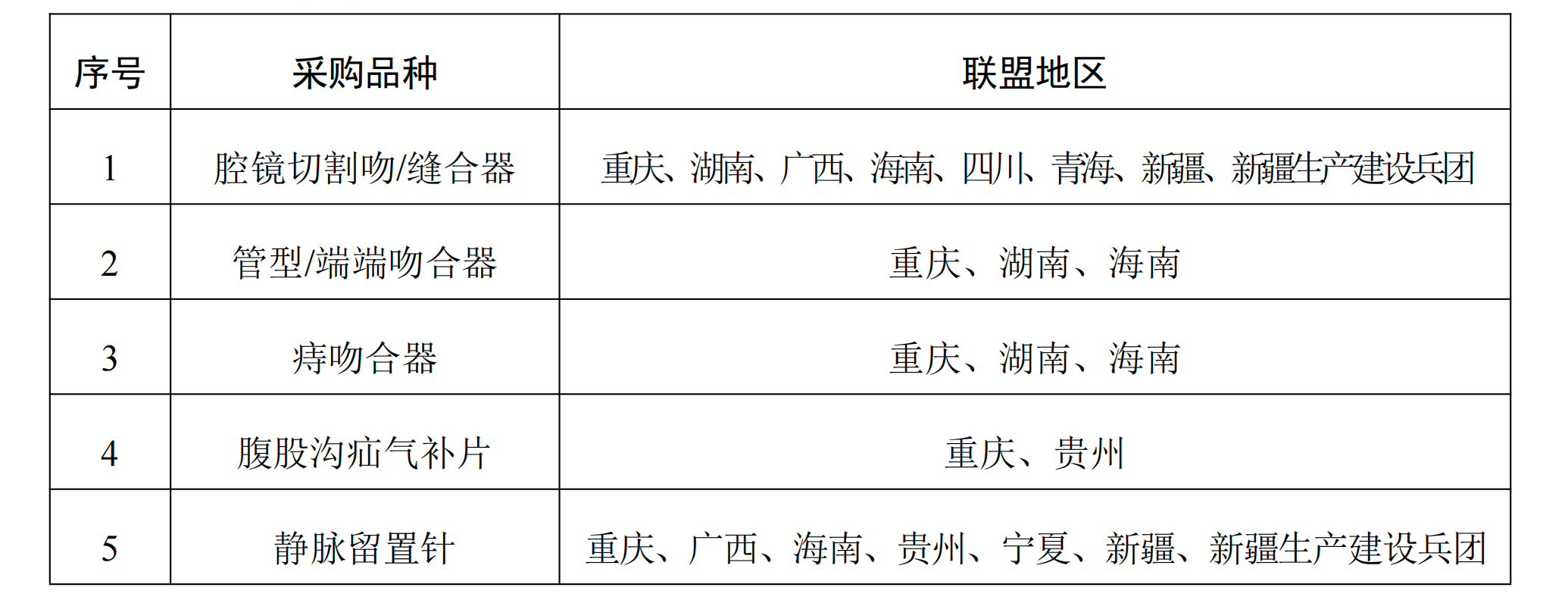 根據(jù)文件,重慶、湖南、廣西、海南、四川、貴州、青海、寧夏、新疆、新疆生產(chǎn)建設(shè)兵團(tuán)聯(lián)盟采購地區(qū)成立了耗材集中帶量采購協(xié)議期滿聯(lián)盟地區(qū)接續(xù)采購工作領(lǐng)導(dǎo)小組辦公室,代表聯(lián)盟地區(qū)醫(yī)療機(jī)構(gòu)開展接續(xù)采購,采購品類為吻合器(腔鏡切割吻/縫合器、管型/端端吻合器、痔吻合器)、腹股溝疝氣補(bǔ)片、靜脈留置針三類。