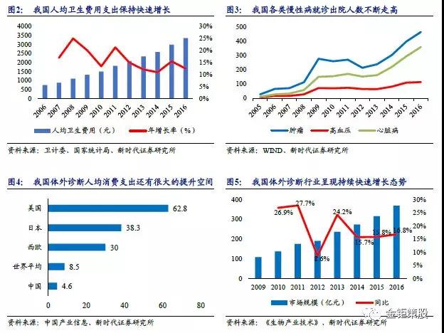 可以看到我國人均衛(wèi)生費用支出保持持續(xù)快速增長,各類慢性病(腫瘤、心臟病、高血壓等)的出院人次也是迭創(chuàng)新高。目前我國的診斷滲透率還比較低,從整體體外診斷人均消費來看,我國人均體外診斷消費金額僅4.6美元,相較全球平均水平8.5美元還有較大的差異,和發(fā)達國家歐美日等相比更是還有十倍的差距。我國體外診斷行業(yè)過去幾年已經(jīng)取得了快速的發(fā)展,行業(yè)規(guī)模從2009年的108億增長到了2016年的369億,年均復合增長率高達16.6%。未來隨著人口老齡化的加劇,人均醫(yī)療費用支出的增長以及技術(shù)的進步,我國體外診斷行業(yè)未來5年都有望保持持續(xù)快速發(fā)展,千億市場值得期待。