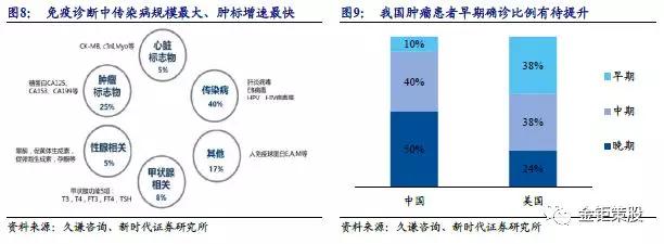 傳染病規(guī)模最大,腫瘤標志物增速最快,國產(chǎn)企業(yè)技術(shù)突破首選的兩大方向。免疫診斷常見應用領(lǐng)域有傳染病、腫瘤標志物、性腺、心臟標志物、甲狀腺等等,其中傳染病和腫瘤標志物規(guī)模較大,分別占據(jù)了40%和25%的比例。傳染病檢測規(guī)模最大,而腫瘤標志物檢測則增速更快,更具增長潛力。