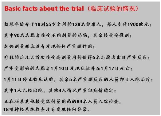 4月份,法國(guó)國(guó)家藥品衛(wèi)生品管理局發(fā)布報(bào)告:指出該臨床試驗(yàn)設(shè)計(jì)不合理,連續(xù)5天給患者增大劑量注射藥物可能是造成嚴(yán)重副作用的罪魁禍?zhǔn)住?/p>