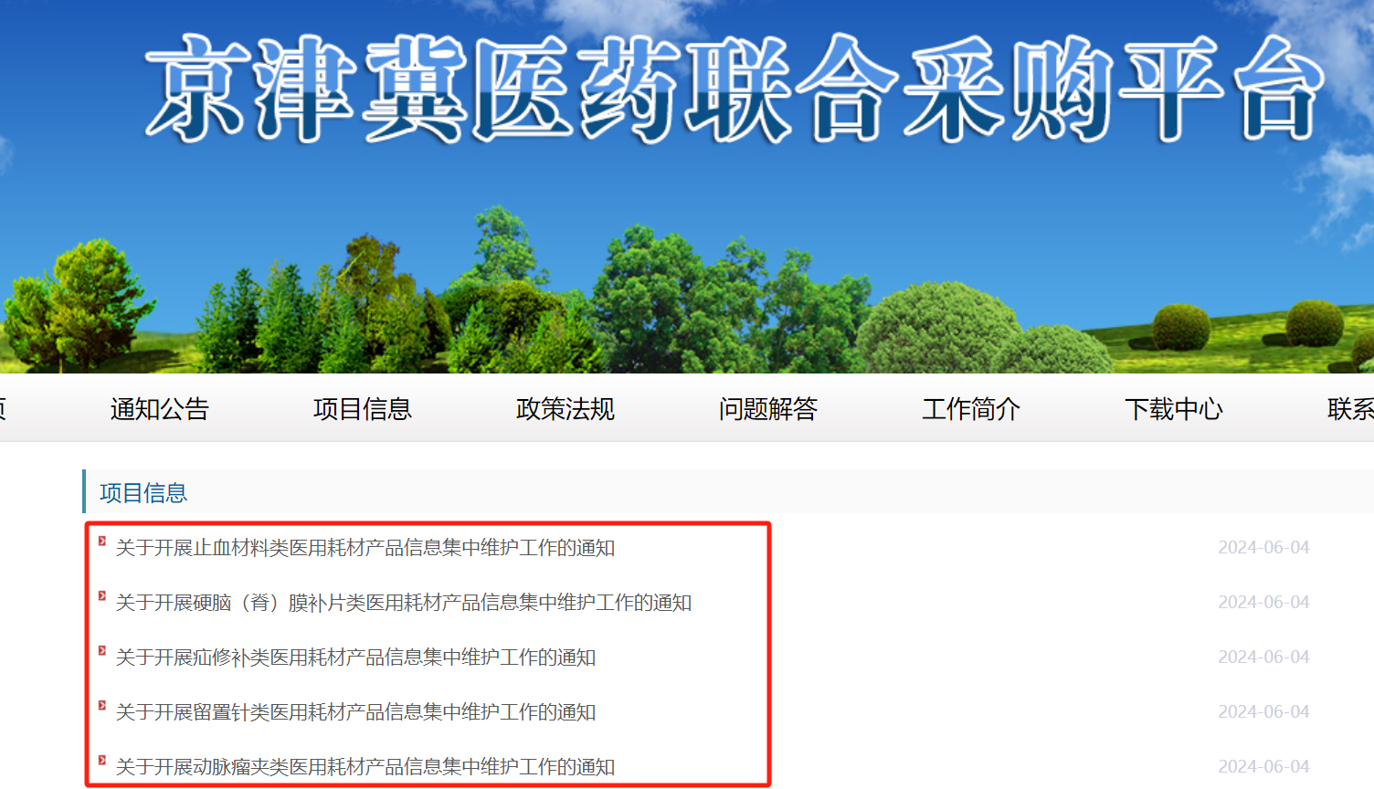6月4日,天津市醫(yī)藥采購(gòu)中心接連發(fā)布發(fā)布5則通知:將于6月6日起對(duì)動(dòng)脈瘤夾、留置針、疝修補(bǔ)、硬腦(脊)膜補(bǔ)片、止血材料5類耗材開(kāi)展信息集中維護(hù)工作。