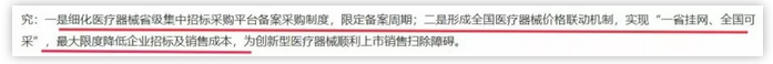 國家醫(yī)保局強調(diào),將細(xì)化醫(yī)療器械省級集中招標(biāo)采購平臺備案采購制度,限定備案周期;形成全國醫(yī)療器械價格聯(lián)動機制,實現(xiàn)“一省掛網(wǎng)、全國可采”,最大限度降低企業(yè)招標(biāo)及銷售成本。