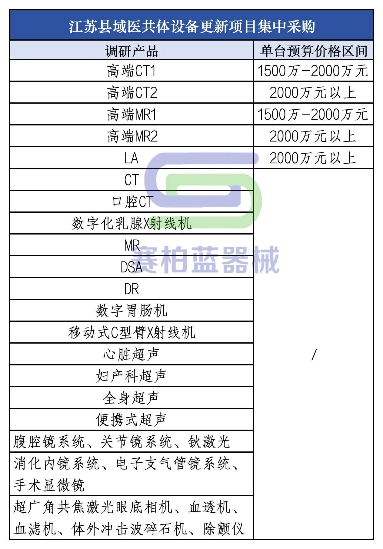 今年以來,江蘇省還對高端CT、高端MR和LA,以及腹腔鏡系統(tǒng)、關(guān)節(jié)鏡系統(tǒng)、鈥激光、消化內(nèi)鏡系統(tǒng)、電子支氣管鏡系統(tǒng)、手術(shù)顯微鏡、超廣角共焦激光眼底相機、血透機、血濾機、體外沖擊波碎石機、除顫儀等設備開展了集中采購調(diào)研。