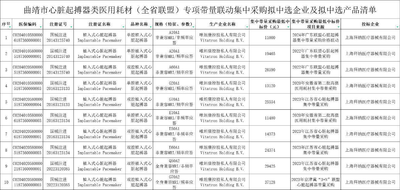 本次集采由曲靖市牽頭,云南全省參與。采購(gòu)品種為心臟起搏器類、心臟除顫器類和心臟起搏除顫器配套使用的導(dǎo)線類醫(yī)用耗材,部分?jǐn)M中選結(jié)果如下:
