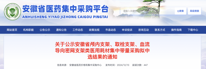 12月13日,安徽省醫(yī)藥集中采購平臺發(fā)布《關(guān)于公示安徽省顱內(nèi)支架、取栓支架、血流導(dǎo)向密網(wǎng)支架類醫(yī)用耗材集中帶量采購擬中選結(jié)果的通知》,于2024年12月13日至2024年12月17日17:30進(jìn)行公示。