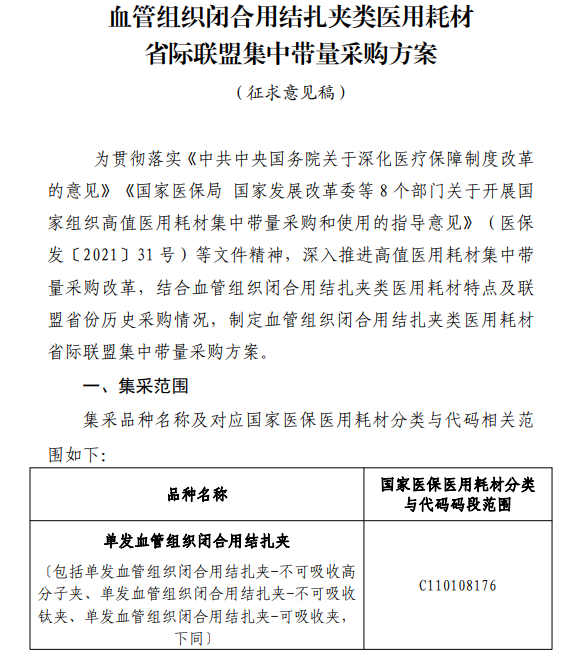 5月21日,福建省醫(yī)保局火速發(fā)布《血管組織閉合用結扎夾類醫(yī)用耗材省際聯(lián)盟集中帶量采購方案(征求意見稿)》(以下簡稱《征求意見稿》)(附文末),意見征求截止于5月28日。