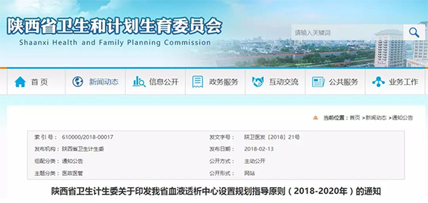 2月28日,陜西省衛(wèi)計(jì)委發(fā)布《關(guān)于印發(fā)我省血液透析中心設(shè)置規(guī)劃指導(dǎo)原則(2018-2020年)的通知》。