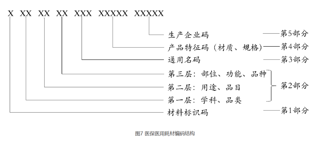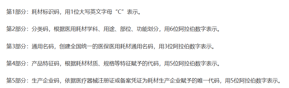 根據(jù)國家醫(yī)保局印發(fā)的《醫(yī)療保障標(biāo)準(zhǔn)化工作指導(dǎo)意見》,醫(yī)保醫(yī)用耗材編碼分5個部分共20位,通過大寫英文字母和阿拉伯?dāng)?shù)字按特定順序排列表示。其中第1部分是耗材標(biāo)識碼,第2部分是分類碼,第3部分是通用名碼,第4部分是產(chǎn)品特征碼,第5部分是生產(chǎn)企業(yè)碼。