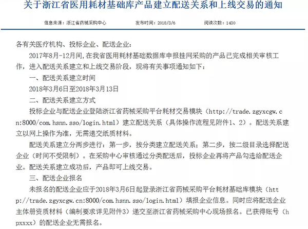3月6日,浙江省藥械采購中心終于發(fā)布了《關(guān)于浙江省醫(yī)用耗材基礎(chǔ)庫產(chǎn)品建立配送關(guān)系和上線交易的通知》(《通知》),意味著浙江省“三流合一”醫(yī)用耗材采購新平臺配送關(guān)系建立開始落地!