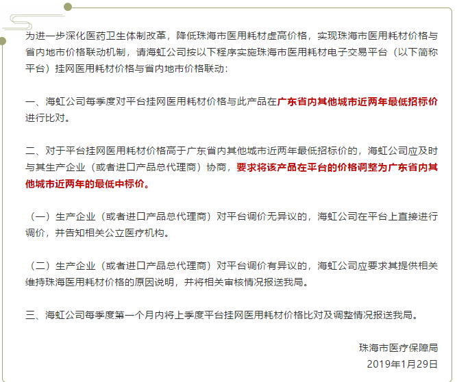 1月30日,珠海市醫(yī)療保障局發(fā)布《關于實施珠海市醫(yī)用耗材電子交易平臺掛網(wǎng)醫(yī)用耗材價格聯(lián)動機制的通知》。